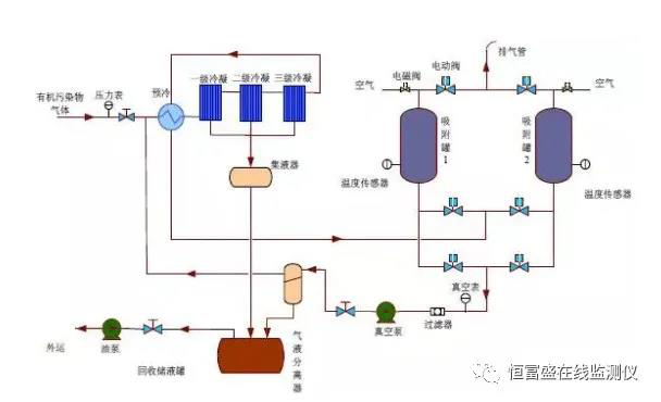 該技術采用多級冷凝技術,使廢氣的有機成分在常壓下凝結成液體析出,經凈化后的廢氣進入吸附器進一步吸附富集,同時確保達標排放。吸附飽和后的吸附劑(活性炭、沸石等)等采用負壓脫附方式再生吸附劑,并將高濃度 VOCs 送回前端冷凝裝置。