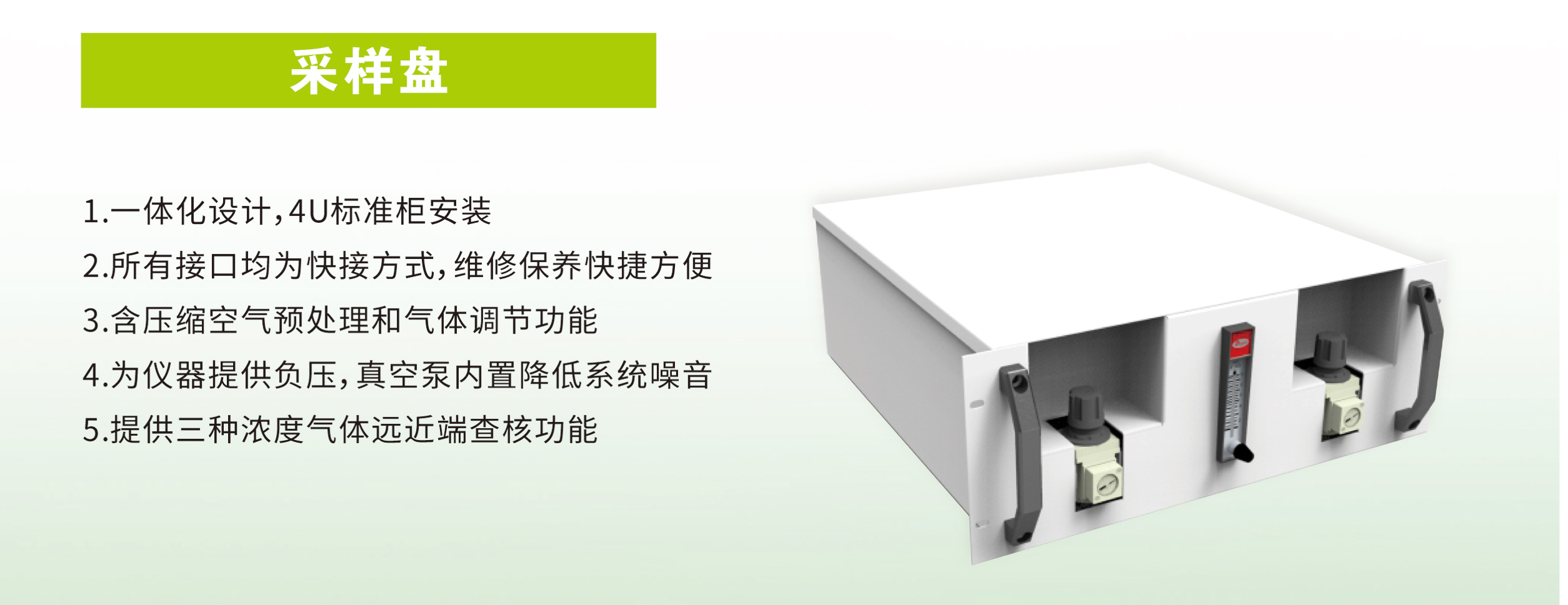 一體化設(shè)計,4U標(biāo)準(zhǔn)柜安裝;所有接口為快接方式,維修保養(yǎng)快捷方便;含壓縮空氣預(yù)處理和氣體調(diào)節(jié)功能;為儀器提供負(fù)壓,真空泵內(nèi)置降低系統(tǒng)噪音;提供三種濃度氣體遠(yuǎn)近端核查功能。